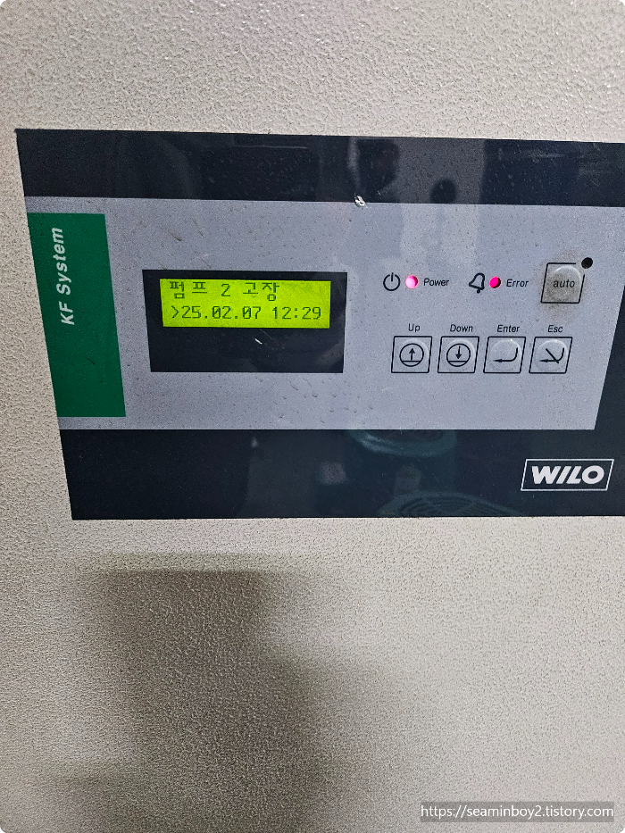 전문적으로 수리하는 사람은 아니기에 기본적인 지식만으로 문제가 발생이된 부스터 펌프를 확인하여 점검합니다. 우선 어떤 문제가 있기에 에러가 뜨고 정지가 되었기 때문에 우선 어떤 문제점이 있었는지 에러 내용을 확인합니다 에러 내용을 확인하니 2월 7일경 2번 펌프가 고장이 발생이 된 상태입니다. (오늘은 3월 4일)