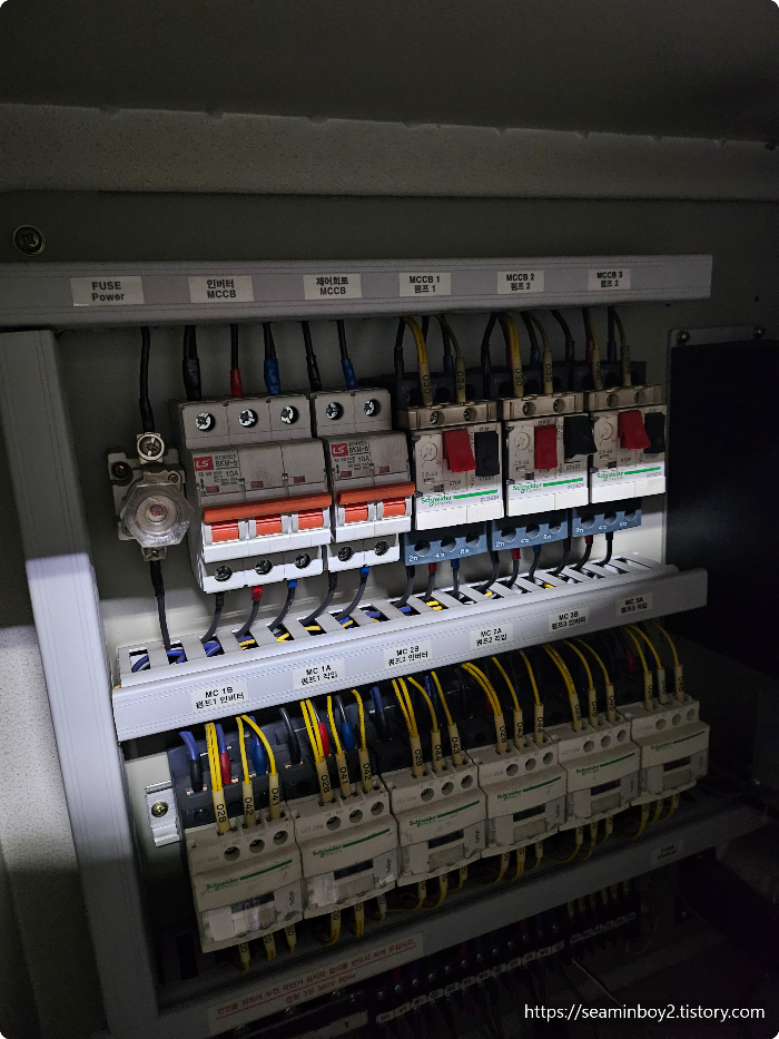 내부를 확인하니 우측 상부 차단기 3개 중 2번 차단기가 꺼져 있습니다. 2번 펌프는 사용하지 않는 상태인 것 같습니다. 그럼 1번과 3번을 사용가능이라고 생각을 하고 제어함 내부의 차단기를 내려 전원을 모두 꺼줍니다. 에러가 생겼을 때는 전원을 꺼주는 것만으로도 효과가 상당합니다.