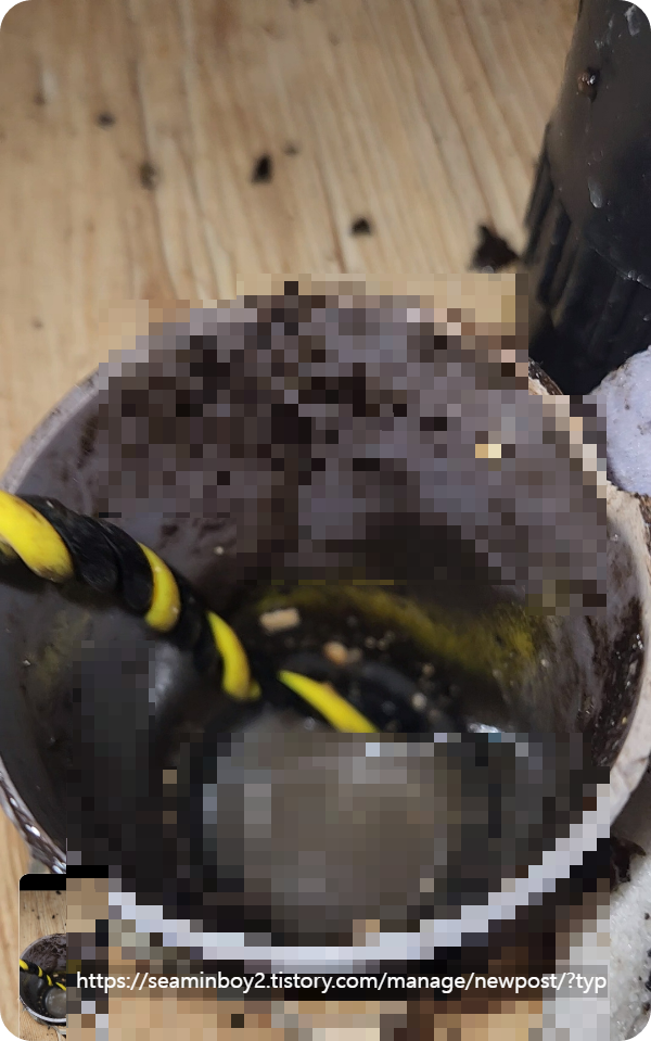 처음에 한 바가지 물을 부으면 잘빠진듯하다가 끝에 3분의 1 정도가 넘치는 상황입니다. 물이 안 빠지는 건 아니지만 무언가 안에 걸려있어 잘빠져 나가지 않는 느낌입니다.