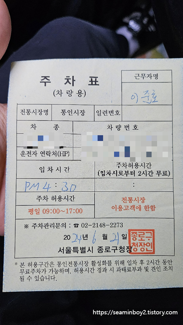 주차를 하면 관리하시는 분이 오셔서 주차 확인증을 꽂아 놓으십니다. 확인증에는 2시간 가능이라고 적혀있는데 1시간이라고 합니다. 주차시간 확인을 위하여 그런것 같습니다. 자리가 협소하여 붐비는 시간대에 주차가 가능할지는 모르겠습니다. 제가 도착한 시간은 4시 30분경이어서 자리가 그나마 있었던것 같습니다. 17시가 넘어가면 단속될수 있다고하니 시간을 잘확인해야 겠습니다.